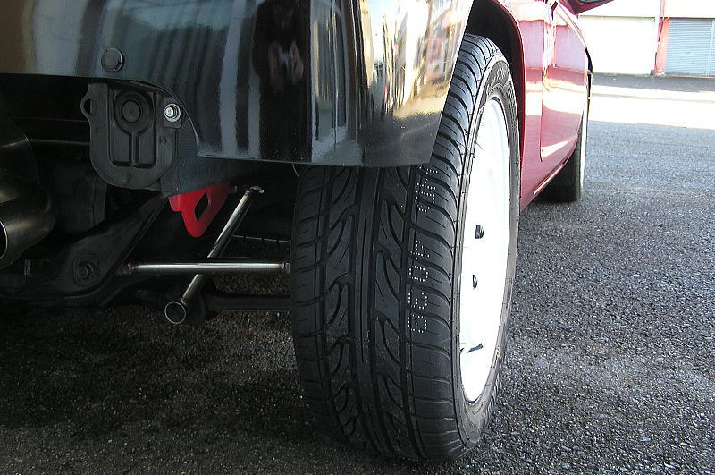 走り屋っぽいエイトスポークのアルミホイールから、純正品のスチールホイールを白色に塗装したものに変更して、タイヤは前後ともに165サイズ(前後で扁平率を変えてあり)を履かせています。